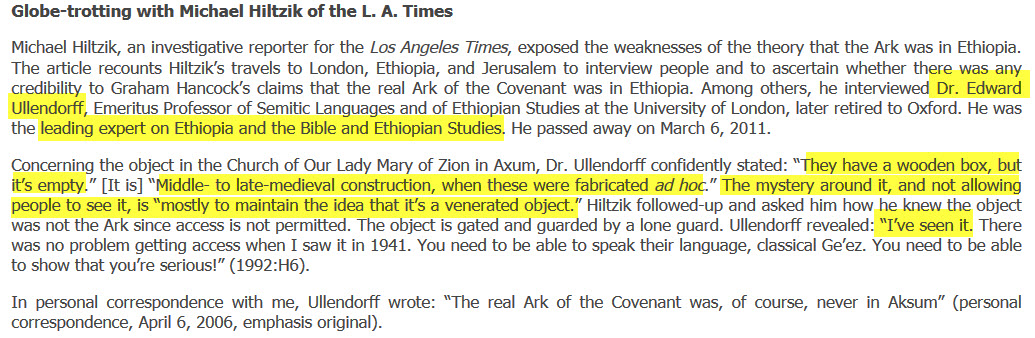 Ullendorff states that he viewed the Ark during World War II after forcing his way into the guarded area at Our Mary of Zion with British Soldiers after conquering the area from the Italians in 1941. From a page on Gordon Franz's website at www.lifeandland.org.
