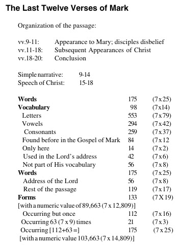Ivan Panin found these remarkable attributes on the numerics regarding Mark Chapter 16 which would not be there if the verses of nine through twenty were removed: