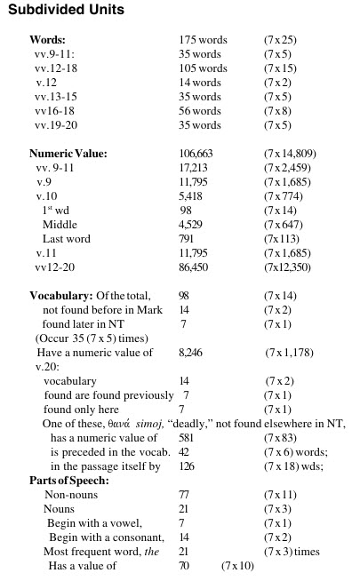 This is one partial example just using the Greek word counts in Chapter 16 where verses one through 20 must be used to have the count of Greek words divisible by seven.