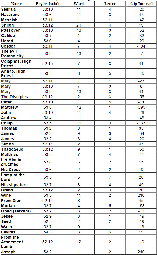 This chart gives the details, as found on BibleProbe's BibleCode webpage, concerning Yacov Rambsel's work on the Suffering Servant in the book named "My Name is Jesus". Note this author hasn't purchased this book yet, and the credit of the following table is either from Bible Code or the book.