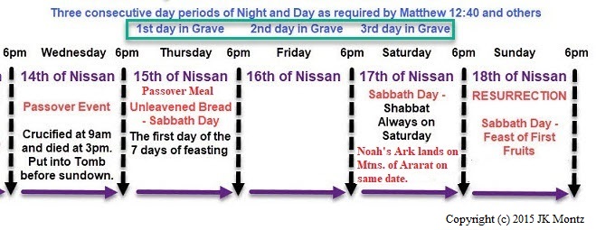 | 6pm to 6pm | 24-hours in the Ground | 15th of Nisan - 6pm on Wednesday to 6pm on Thursday (First of three days in the Tomb in the earth.) |